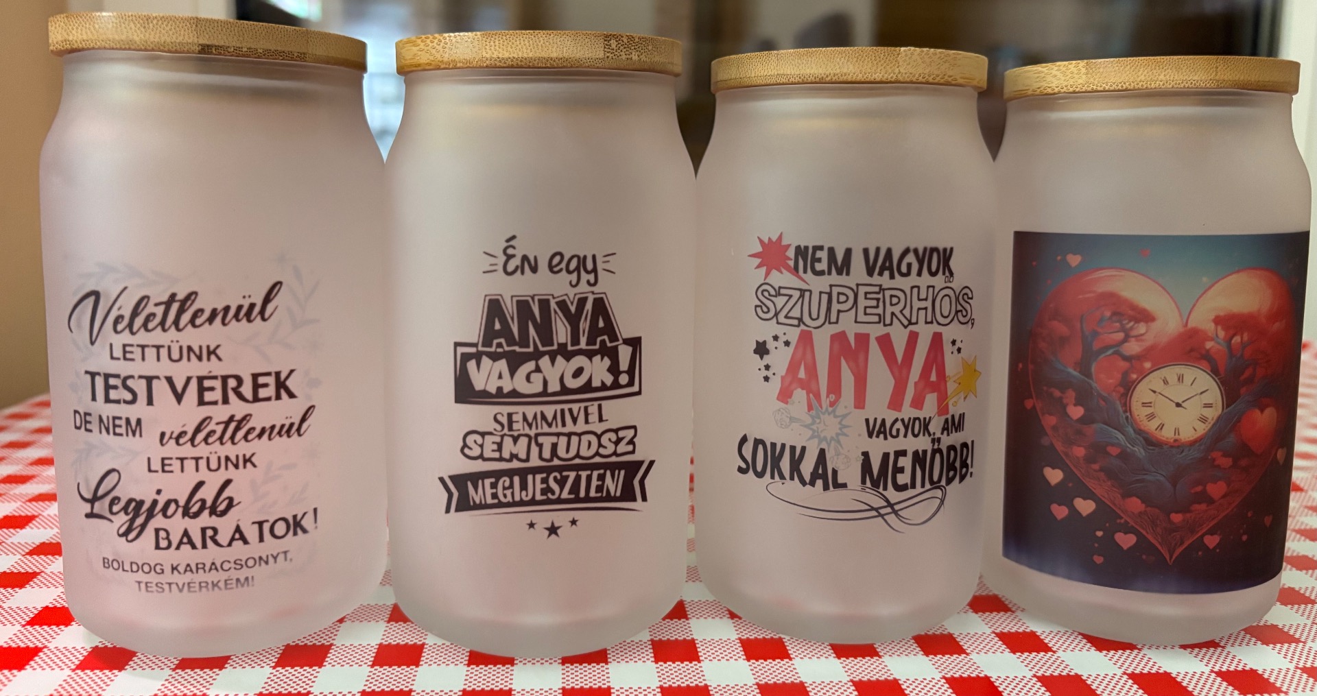 400ml-es szublimációs technikával díszített üvegpoharak bambusz fedővel.